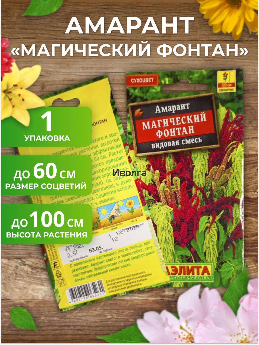 Амарант "Магический фонтан" смесь сортов - смесь амарантов метельчатого и хвостатого. Мощные растения высотой около 100 см украшены эффектными соцветиями, напоминающими перья страуса или хвост лисицы. Соцветия ветвистые, поникающие или прямостоячие, длиной до 60 см. Растения быстрорастущие, декоративны с начала июля до заморозков. Из них получаются прекрасные высокие бордюры, которыми можно задекорировать стены и заборы. Группы или одиночные растения хорошо смотрятся в центре клумб, на фоне кустарников, на заднем плане смешанных цветников, в декоративных огородах. Соцветия используют в букетах, в т. ч. зимних.