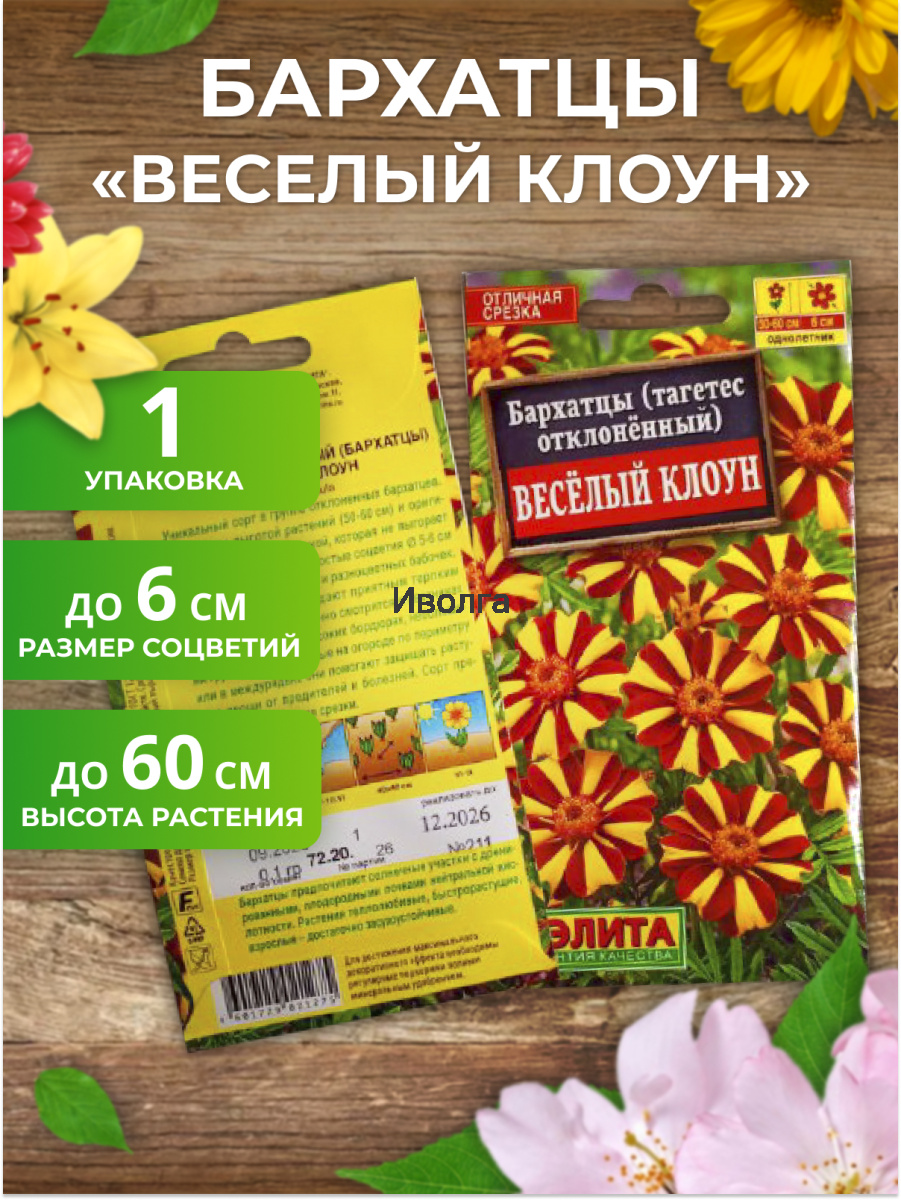 Бархатцы (тагетес отклонённый) "Веселый клоун" - сорт бархатцев с оригинальной полосатой окраской. Кусты высотой около 50 см, сильноветвистые, обильно усыпаны соцветиями диаметром 5-6 см в течение всего лета. Окраска соцветий не выгорает на солнце. Растения неприхотливые, не требовательные к почвам, относительно засухоустойчивые. Отлично смотрятся в цветниках, великолепно растут в контейнерах. Прекрасно подходят для срезки, дольше других сортов сохраняя в воде свежесть и красоту.