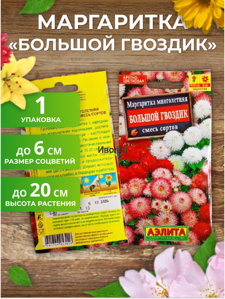 Маргаритка многолетняя "Большой гвоздик" смесь сортов - густомахровая маргаритка с игольчатыми, нарядными корзинками, достигающими 6 см в диаметре – настоящая жемчужина селекции. Растения с компактной розеткой, выравненные, с многочисленными и прочными цветоносами, зацветают раньше обычных сортов. Цветение обильное и продолжительное (до 3-х месяцев).