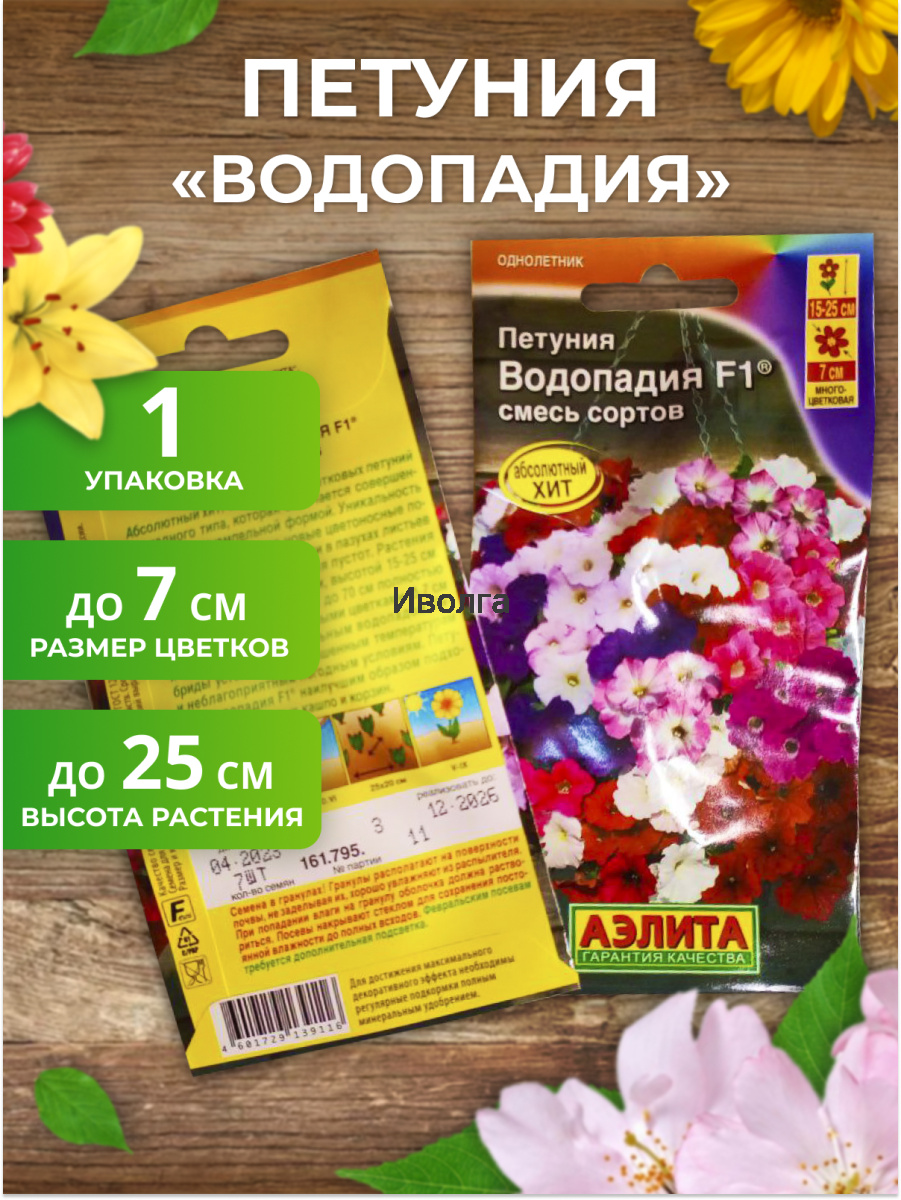 Петуния "Водопадия F1" смесь сортов - серия многоцветковых петуний каскадного типа, которая отличается совершенно новой полуампельной формой. Уникальность этих гибридов в том, что новые цветоносные побеги образуются без прищипки в пазухах листьев в середине куста, не оставляя пустот. Растения формируют пышные кустики, высотой 15-25 см. Поникающие побеги длиной до 70 см полностью усыпаны яркими насыщенными цветками диаметром 7 см. и спускаются восхитительным водопадом. Гибриды устойчивы к повышенным температурам и неблагоприятным погодным условиям.