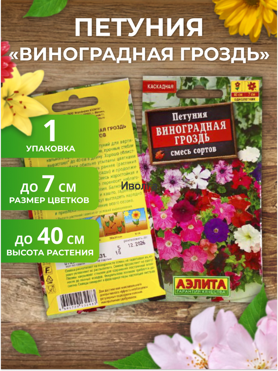 Петуния "Виноградная гроздь" смесь сортов - яркая смесь каскадных петуний для вертикального оформления. Гибкие, прочные стебли вырастают* до 40 см в длину. Хорошо об лиственные побеги обильно усыпаны цветками 5-7 см. Цветение очень раннее (растения зацветают на стадии рассады) и продолжительное, до заморозков. Смесь жаростойкая засухоустойчивая, хорошо переносит неблагоприятные погодные условия. Балконные ящики, подвесные корзины и кашпо, задекорированные этой смесью, будут выглядеть нарядно и привлекательно в течение всего сезона.