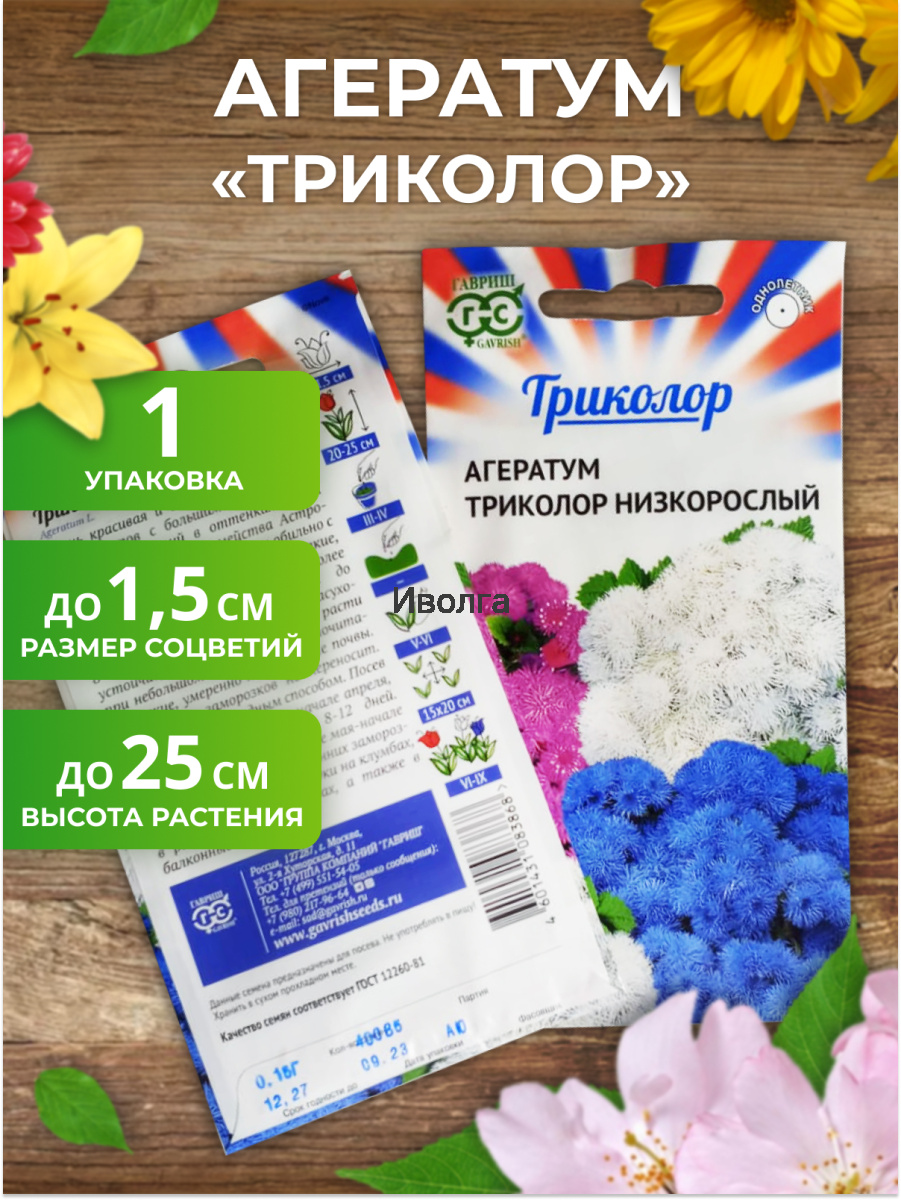Агератум низкорослый "Триколор" - очень красивая и длительно цветущая смесь сортов с большими пушистыми шапками соцветий в оттенках флага России! Растение из семейства Астровые, высотой 20-25 см. Цветет обильно с июня до заморозков. Соцветия мелкие, душистые, до 1-1,5 см, собраны в более крупные щитковидные соцветия до 8-10 см в поперечнике. Агератум засухоустойчив, светолюбив, но может расти при небольшом затенении, предпочитает легкие, умеренно плодородные почвы. Теплолюбив, заморозков не переносит. Выращивают рассадным способом.