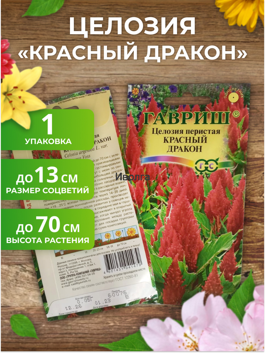 Целозия перистая "Красный дракон" - растения высотой до 70 см с зелеными листьями и оригинальными метельчатыми, густомахровыми соцветиями красной окраски. Цветут с июля по сентябрь. Теплолюбивые растения, наибольшей декоративности достигают при посадке на солнечных, защищенных от ветра, местах и достаточно плодородных почвах.